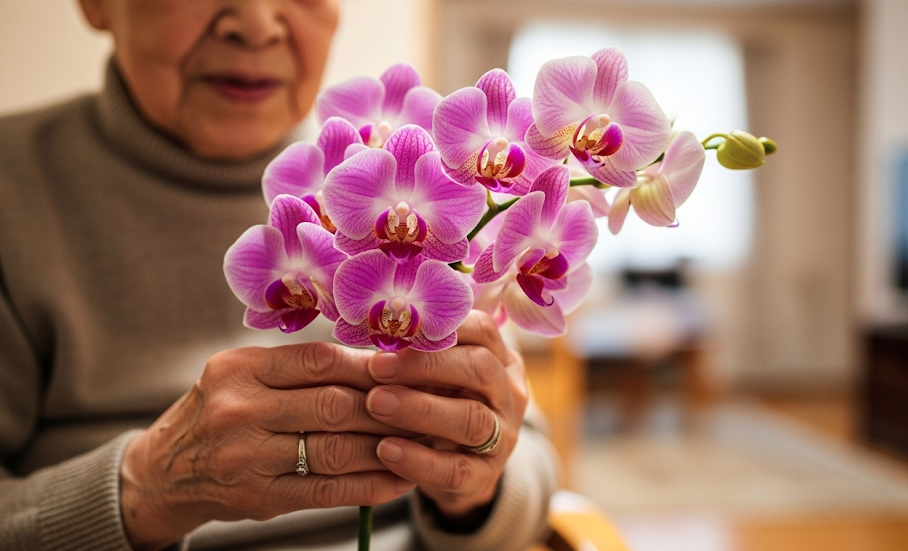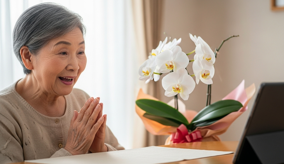 荷物を受け取ったお母様が箱を開け、美しい胡蝶蘭とメッセージカードを目にし、そしてあなたの声を聞く。