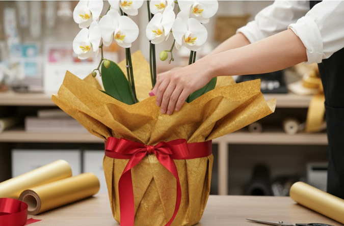 ラッピングは、胡蝶蘭を保護する役割だけでなく、ギフト全体の格を上げ、お祝いの気持ちを華やかに演出するための重要な要素なのです。