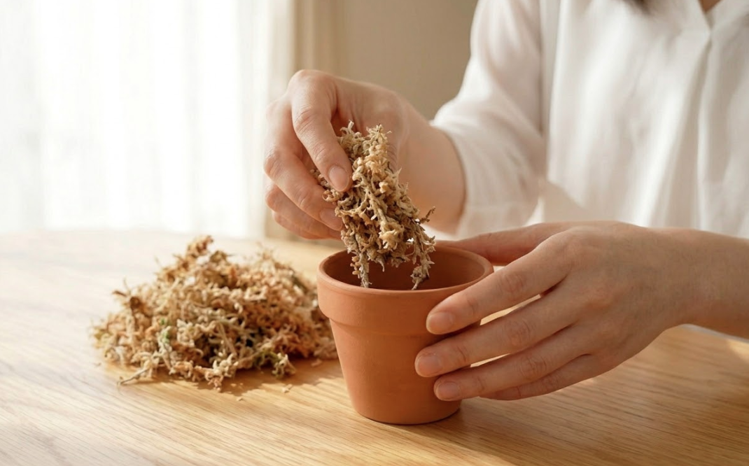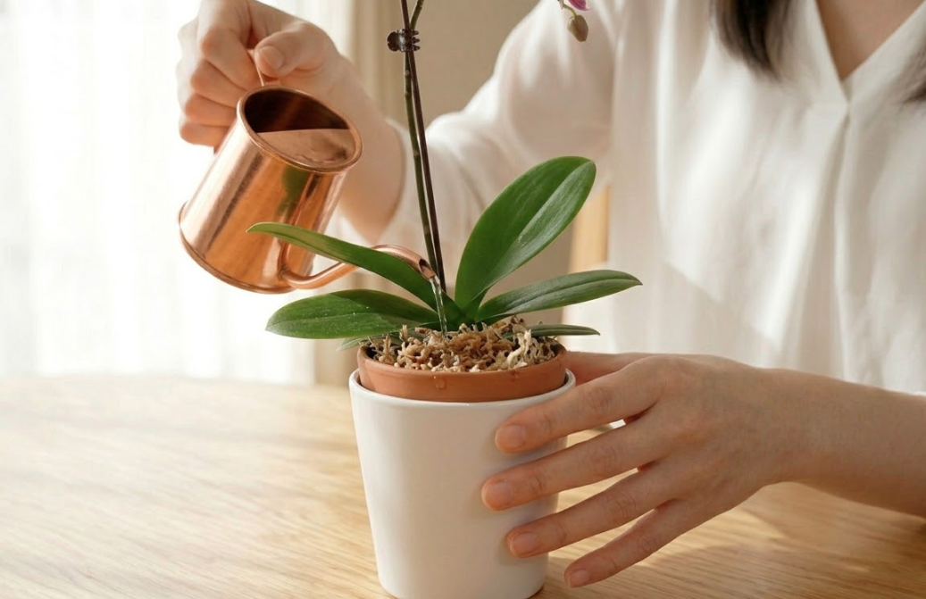 おすすめの組み合わせは、「素焼き鉢 + 水苔」。通気性と吸湿性のバランスが抜群で、初心者の方でも失敗が少ない王道のペアです。ギュウギュウに詰め込みすぎず、かといってスカスカにもならない「ほどよい抱擁感」で根を包んであげてください。胡蝶蘭が「これなら安心して根を張れる!」と思えるような、心地よい新居をプレゼントしてあげましょう。