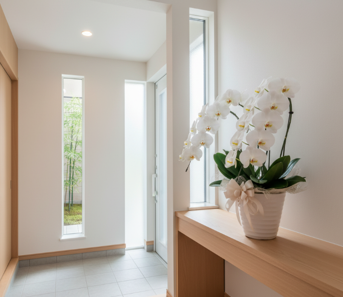 特に、お祝いの気持ちを華やかに伝え、新しい家のインテリアとしても長く楽しめる観葉植物、中でも縁起の良い花言葉を持つ胡蝶蘭を特別なプレゼントとしてご提案します。