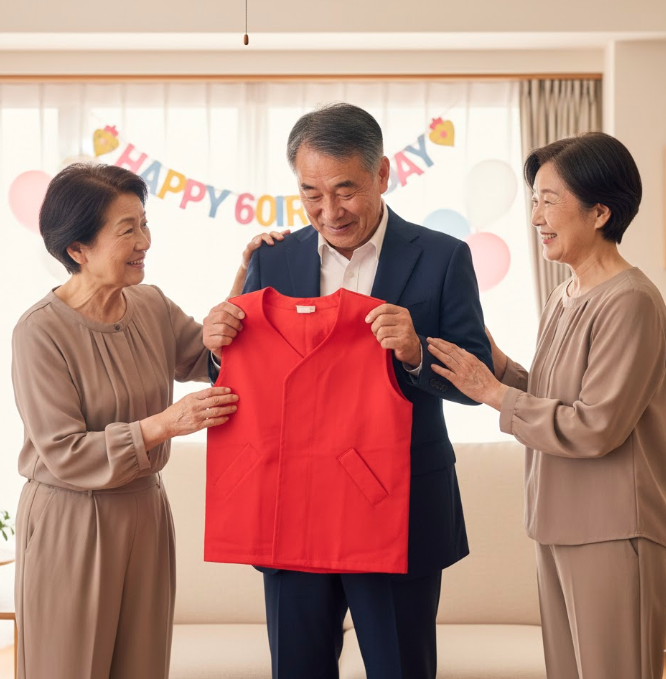 還暦祝いといえば、真っ先に思い浮かぶのが「赤いちゃんちゃんこ」です。暦が一巡して赤ちゃんに戻るという意味から、魔除けの色である赤を身につけるという伝統的な風習ですが、現代の60歳はまだまだ現役で若々しい方が多く、ちゃんちゃんこを着ることに抵抗を感じる男性も少なくありません。「年寄り扱いされたくない」という心理も働くため、必ずしも用意しなければならないものではなくなってきています。