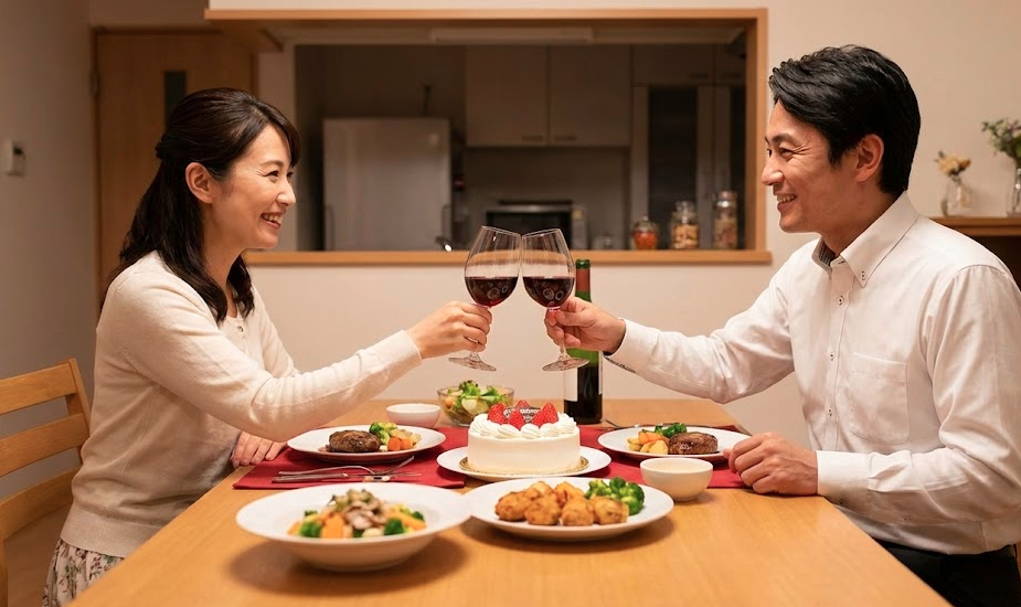昇進祝いのメッセージを夫へ伝えた後は、家族団らんの場でお祝いの食事を楽しむのが定番です。外食で特別なディナーを予約するのも素敵ですが、自宅でリラックスしながら好きなものを食べるスタイルも、夫にとっては最高のご褒美となります。特に、日頃忙しくて家でゆっくり食事ができていない夫にとっては、妻の手料理や、いつもより少し豪華な食材を使った食卓が何よりの癒やしとなるでしょう。