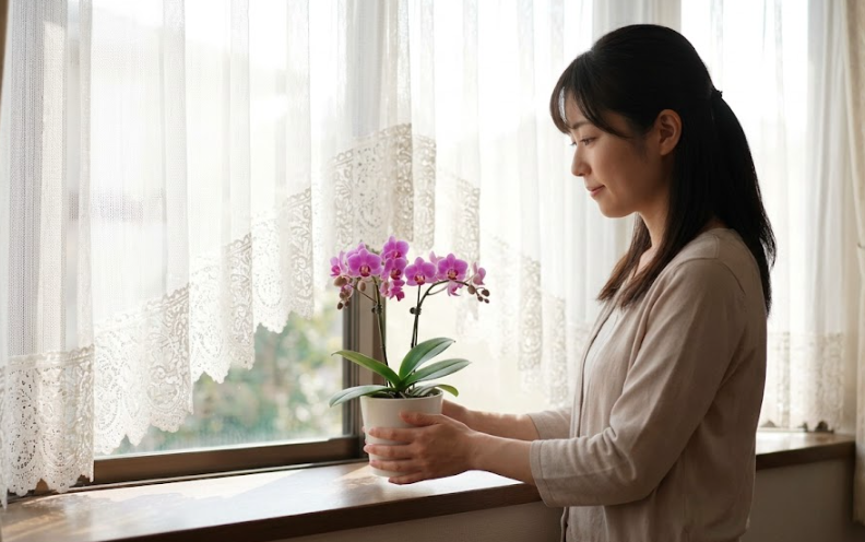 実は私自身、初めてミニ胡蝶蘭を買ってきたとき、良かれと思って窓際の直射日光がガンガン当たる場所に置いてしまったんですよね。数日後、葉っぱが見るも無惨に茶色く焼けてしまって、本当に悲しい思いをしました。