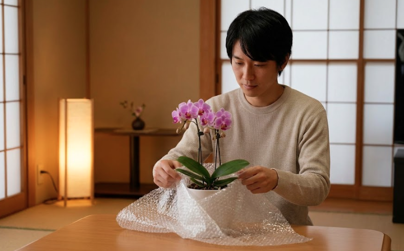 窓際は外の冷気がダイレクトに伝わるので、夜間だけでも部屋の暖かい場所に移動させましょう。段ボールをすっぽり被せたり、プチプチ(緩衝材)で鉢を巻いてあげるのも効果的です。