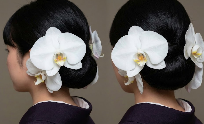 - ポニーテールに胡蝶蘭を添えた現代風スタイル