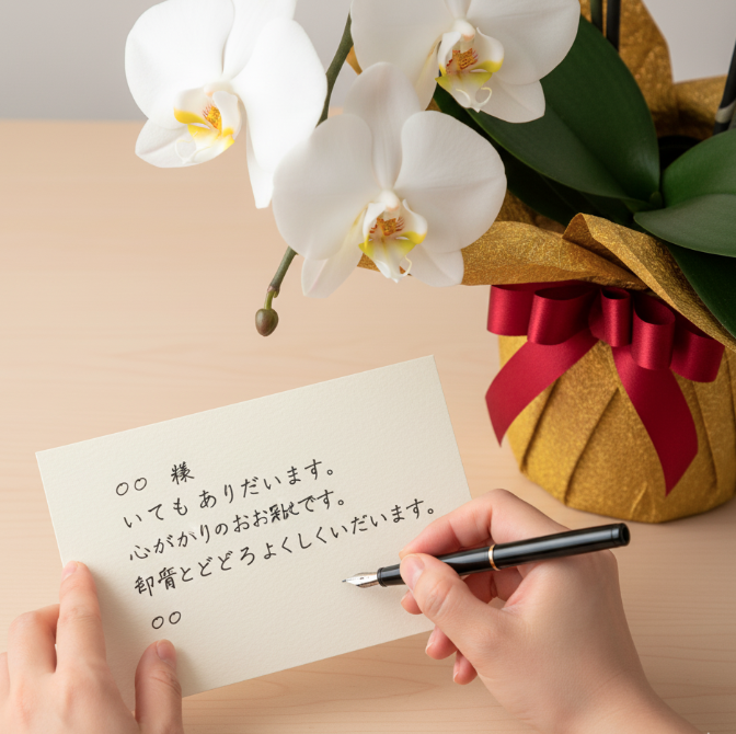胡蝶蘭に立て札を添えるのはフォーマルなマナーですが、よりパーソナルな気持ちを伝えたい場合は、メッセージカードを添えることを強くお勧めします。